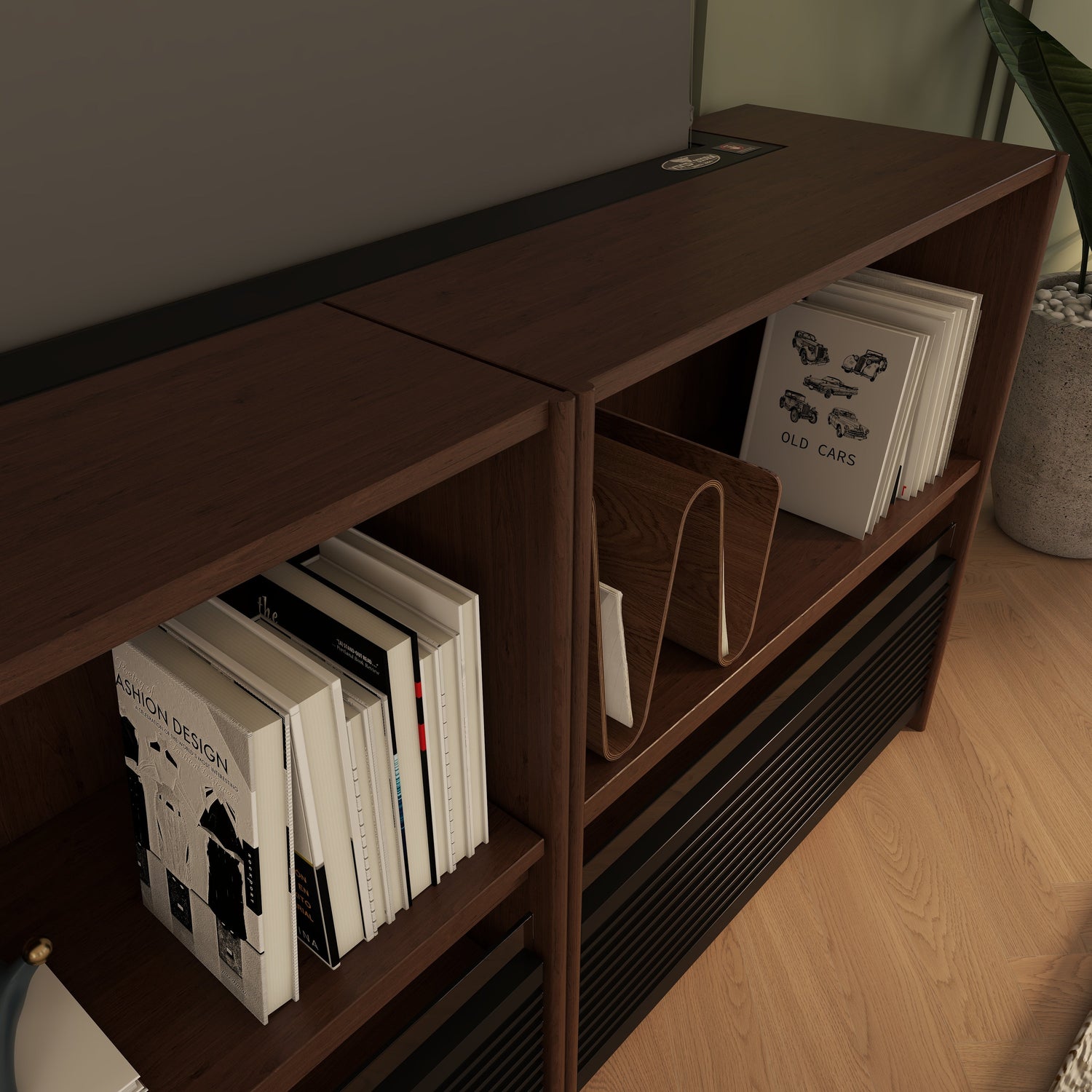 Premium Build & Materials: Made from high-quality wood composite with a luxurious walnut veneer finish, the Nexus exudes sophistication. The sleek black glass drawers feature horizontal grid patterns, adding a touch of industrial modernism to the overall design.