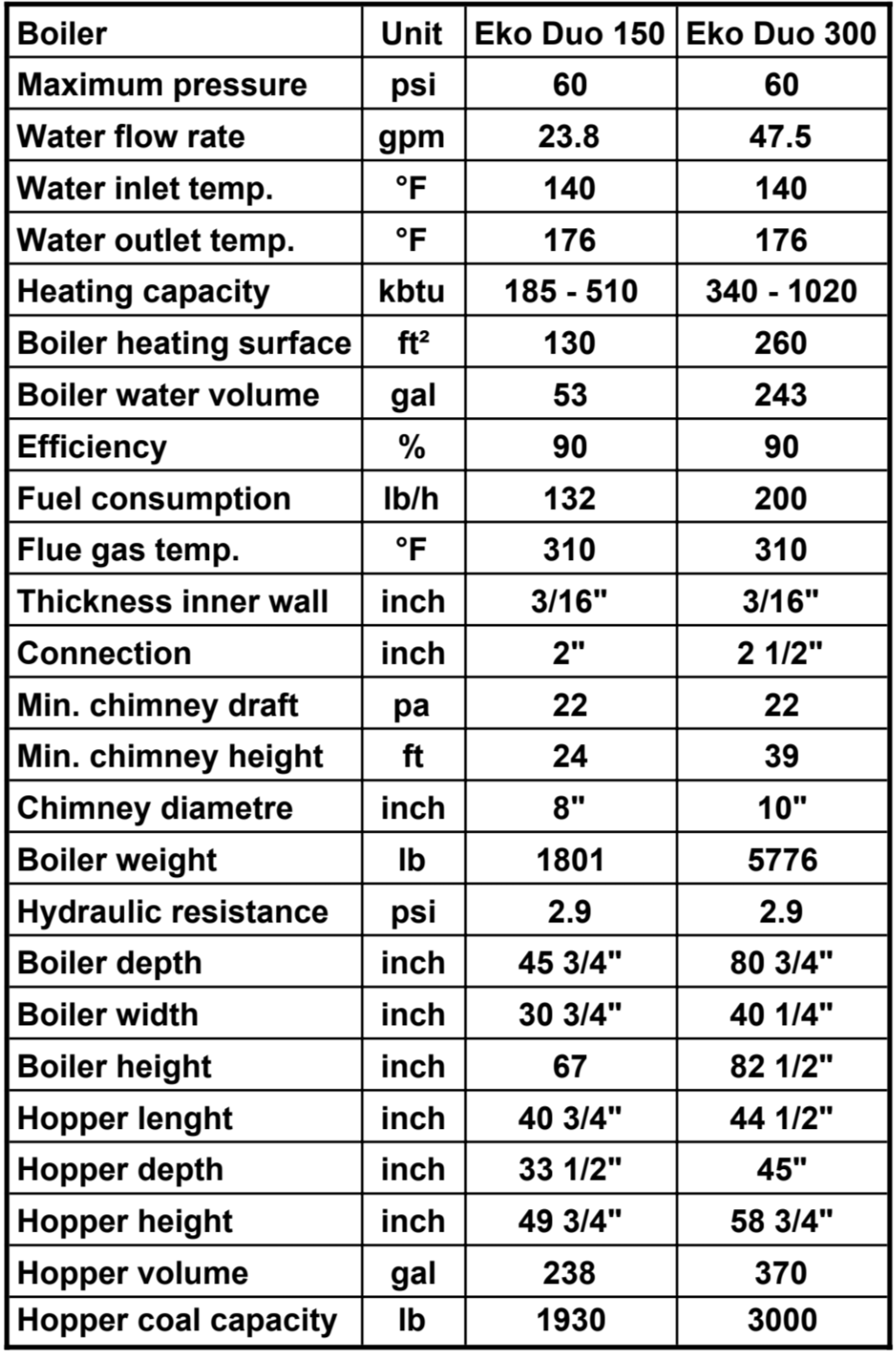 For Commercial use only. Eko Duo is optimized for burning coal up to 1". The boiler cycle to keep hot ashes to ignite next fire. In addition, you may also burn pellets, grains.