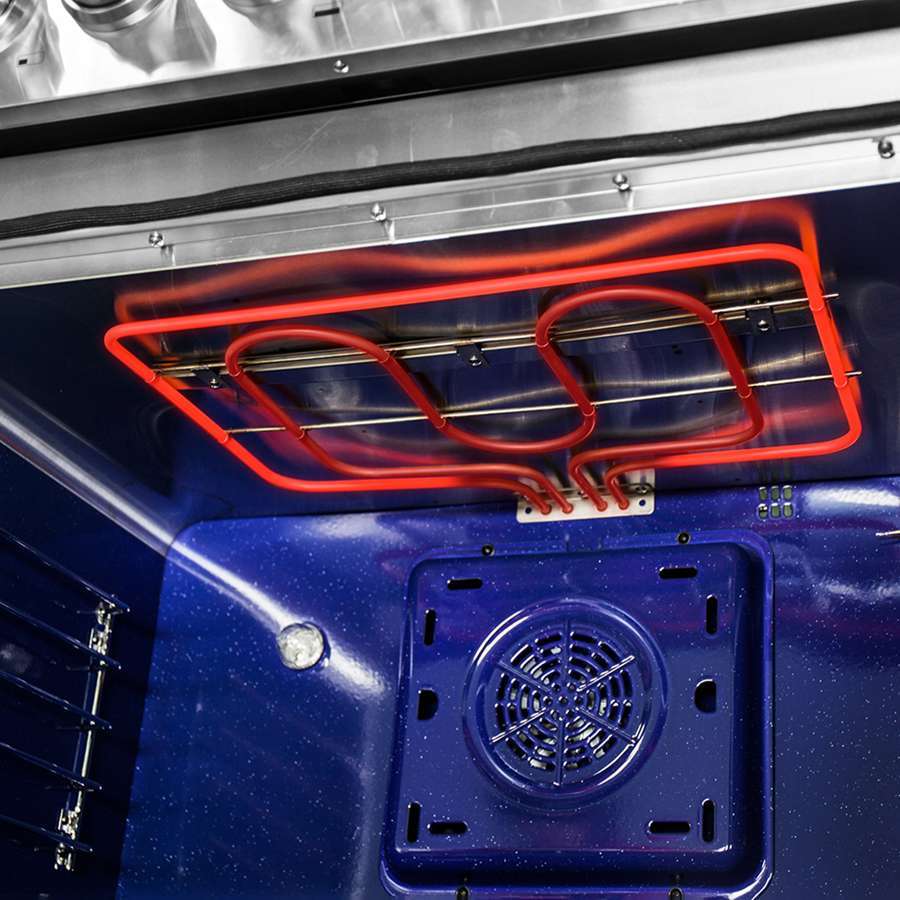 - Enhanced Visibility. The speckled blue enamel oven interior is illuminated by two halogen lights, making it easy to monitor your culinary creations