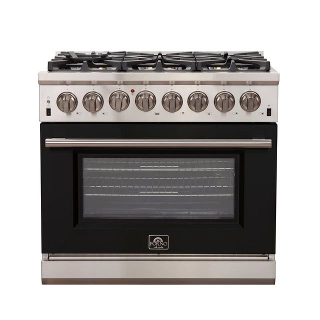 Forno 36 Inch Professional Freestanding Dual Fuel Range in Black is complete with a 6 Italian Sealed Burners Cooktop for energy efficiency, temperature control, and even cooking with a Convection Electric Oven. The 5.26 cu. ft. of deep oven capacity provides a large cooking area.