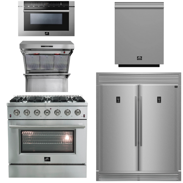 The Forno Appliance Package - 36 in. Galiano Gas Range with 8 Defendi Italian Burners in Stainless Steel, 60 Inch Refrigerator and Freezer, Microwave Drawer, Dishwasher, and Wine Cooler. This appliance bundle is perfect for your next kitchen model, and comes at a highly affordable price! Read more below!