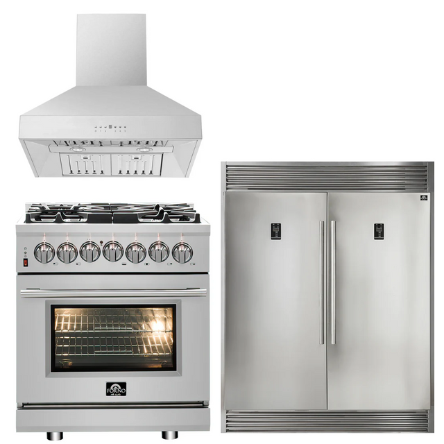 This Forno Kitchen appliance package is complete with a Professional 30" Dual Fuel Range, 30" Range Hood and 60" Refrigerator.