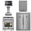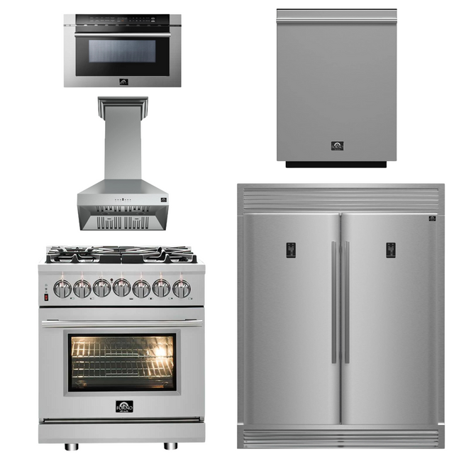 This Forno Kitchen appliance package is complete with a Professional 30" Dual Fuel Range, 30" Range Hood, 60" Refrigerator, 24" Dishwasher and 24" Microwave Drawer.