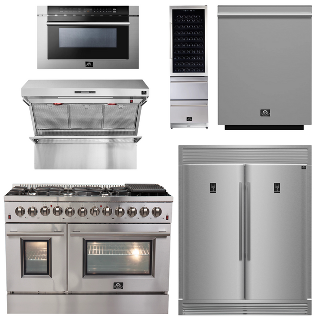 The Forno Appliance Package - 48 in. Dual Fuel Range with 8 Italian Burners in Stainless Steel, Refrigerator and Freezer, Microwave Drawer, Dishwasher, and Wine Cooler. This appliance package is perfect for your next kitchen model, and comes at a highly affordable price! Read more below!