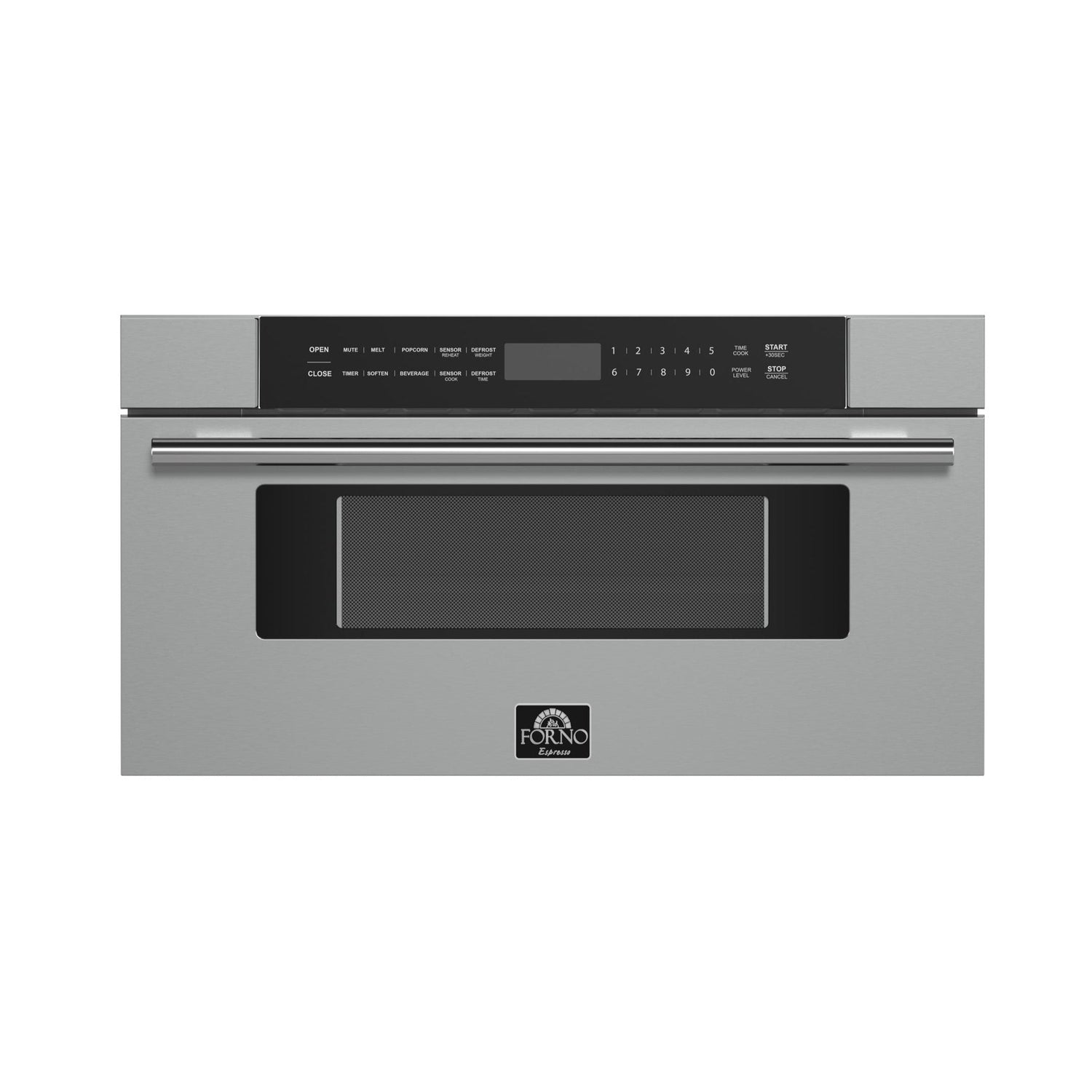 Enhance your kitchen's capabilities with the Forno Espresso 30" Built-In Microwave Drawer in Stainless Steel with Silver Handles. This sleek and efficient microwave drawer, featuring stainless steel and an silver handle, offers a spacious 1.2 cu.ft. capacity and 1,000 watts of power, making it a perfect choice for all your cooking needs.