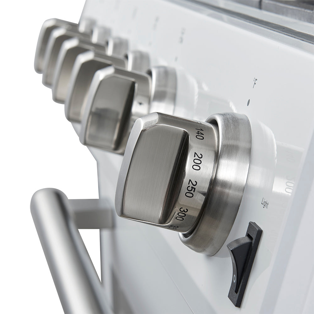 Upgrade your kitchen with the Forno Espresso 30" Gas Range, featuring a high-performance cooktop with 39,500 BTU output and a 5.0 cu.ft. convection oven. Choose between antique brass or silver knobs and handles for added elegance. This gas range is compatible with both natural gas and propane, and comes with a conversion kit.