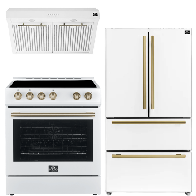 FORNO Espresso Package - 30" Electric Range, Range Hood and Refrigerator in White with Antique Brass Handles