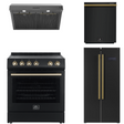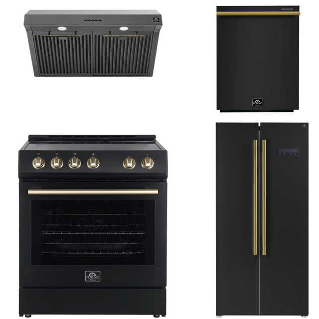 FORNO Espresso Package - 30" Electric Range, Range Hood, Refrigerator and Dishwasher in Black with Antique Brass Handles