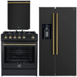FORNO Espresso Package - 30" Gas Range, 36" Refrigerator with Water and Ice Dispenser and Dishwasher in Black with Antique Brass Accents