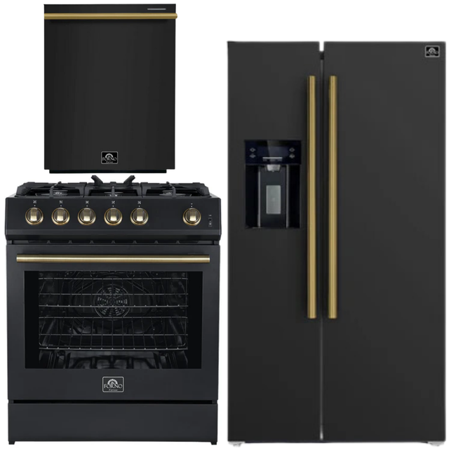Upgrade your kitchen with the Forno Espresso Package, featuring a 30" Gas Range, 36" Refrigerator with Water and Ice Dispenser, and Dishwasher, all in a sleek Black finish with Antique Brass accents. The 30" Gas Range boasts a powerful 39,500 BTU cooktop, five sealed burners, and a 5.0 cu.ft. convection oven for precision cooking. The 36” French Door Refrigerator offers 20 cu.ft. of customizable storage with fast cooling and an automatic ice maker. Completing the set, the quiet 24” Tall-Tub Dishwasher offers a 14-place setting capacity, multiple wash programs, and ENERGY STAR certification for eco-friendly performance.