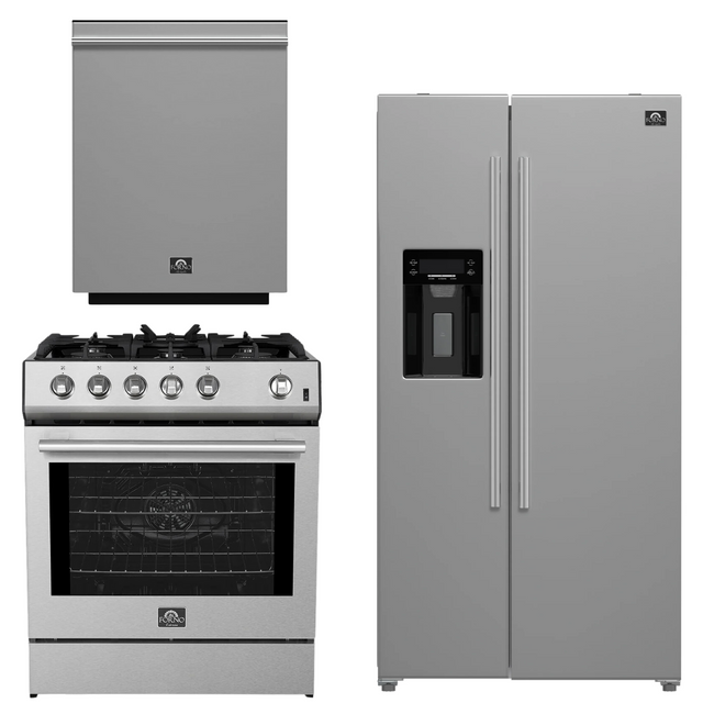FORNO Espresso Package - 30" Gas Range, 36" Refrigerator with Water and Ice Dispenser and Dishwasher in Stainless Steel