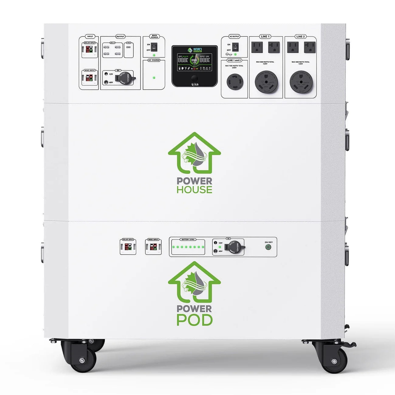 Nature's Generator Powerhouse is designed to meet all your home power needs, featuring a split-phase 240V/7200W or single-phase 120V/7200W (combined) pure sine wave inverter.