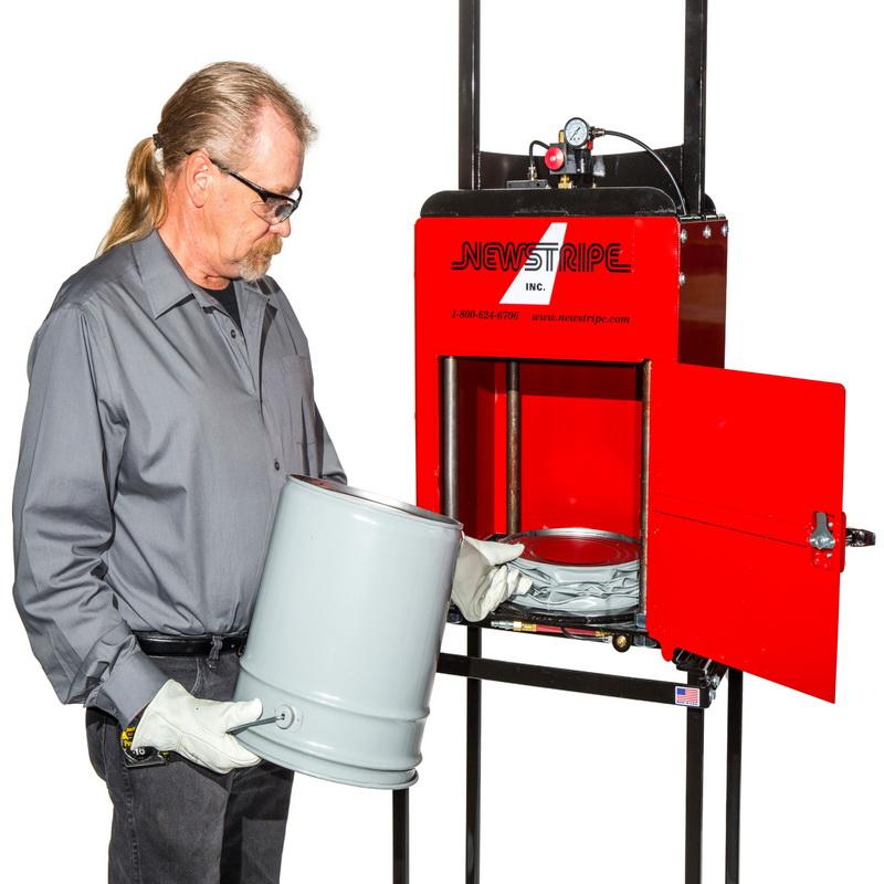Newstripe’s Big Squeeze™ Pail & Industrial Paint Can Crusher reduces the volume of empty containers by up to 75%. One-gallon cans and 5-gallon metal pails are easily crushed using standard shop air. Excess fluids are drained into a separate container for proper disposal, while filters and containers can be recycled and reclaimed as scrap metal. In under a minute, 5-gallon pails are reduced to just 2.5 inches.