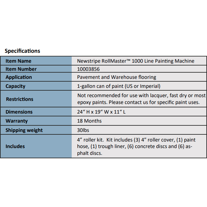 The Newstripe RollMaster 1000 Line Painting Machine is perfect for warehouses, parking lots and playgrounds. The mechanically driven pump does not touch paint for quick, no hassle clean up. Light weight and fold-able handle makes it easy to store and transport. Machine comes with 4 inch Roller Kit (3 pack).