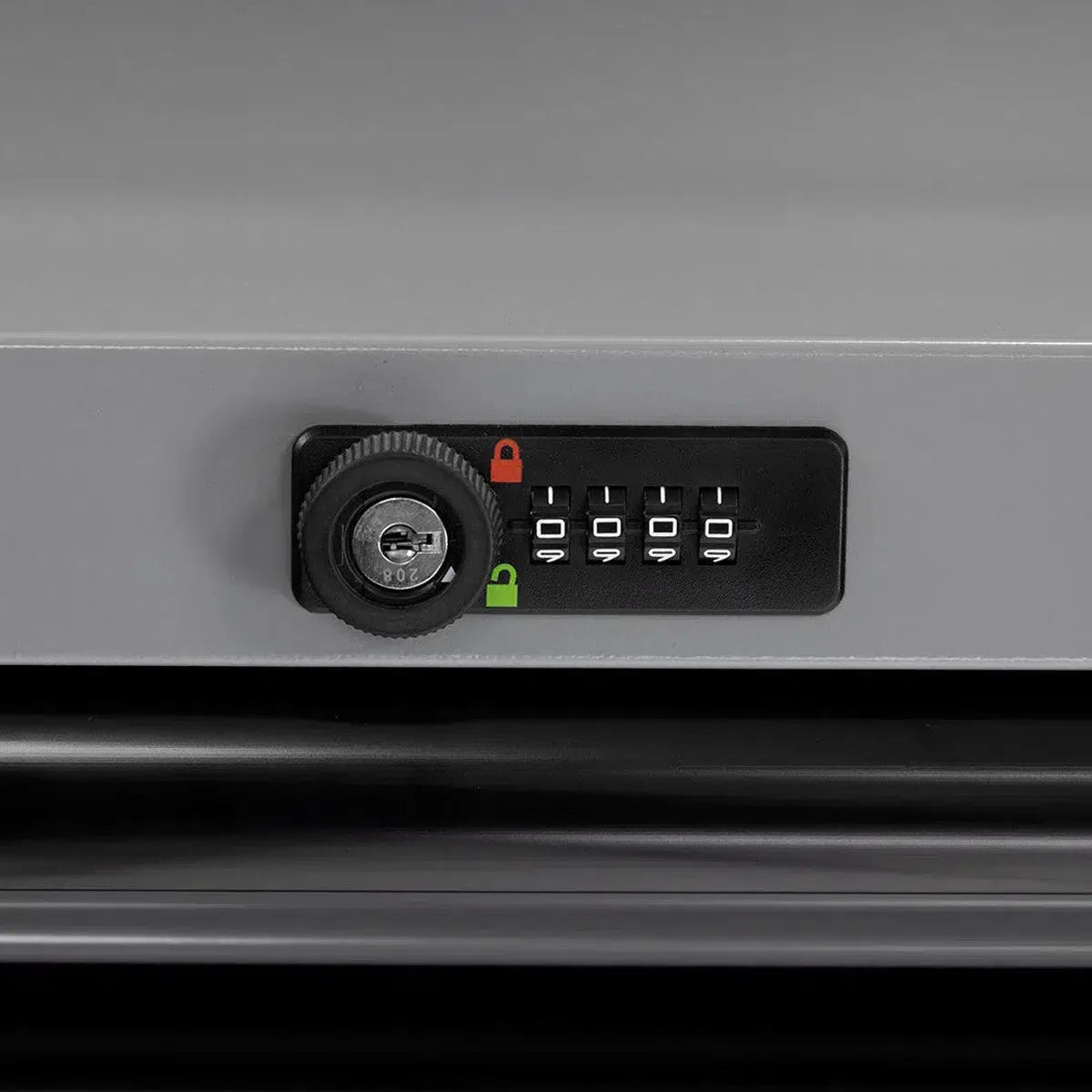 This combo set includes the nardo grey 5-drawer top chest and 6-drawer bottom roll cabinet with grey drawers. The drop front lid on the top chest has a full length piano hinge that is actuated by two heavy-duty gas struts.
