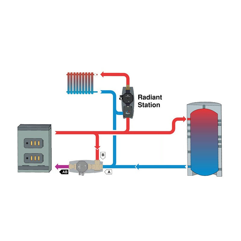 Radiant station purpose is to mix the primary high temperature loop to reduce the supply temperature to the radiant floor setpoint. For example the primary heating loop may operate at 180°F but the floor only needs 100°F. Using our 220VAC Radiant Thermostat the floor temperature can be adjusted according to the outdoor temperature using the motorized valve modulation.