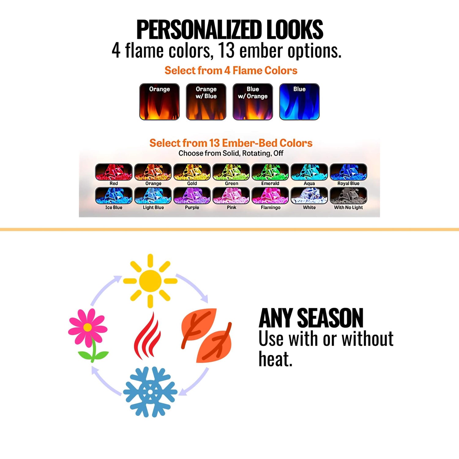 - With four stunning flame colors and 13 ember bed lighting options, you can transform your living space with the simple press of a button.